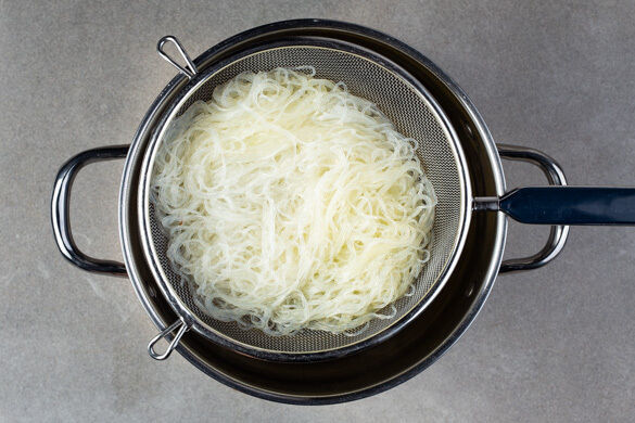 In einem mittelgroßen Topf ausreichend gesalzenes Wasser für die Nudeln aufkochen. Die Nudeln in das kochende Wasser geben, den Topf vom Herd nehmen und die Nudeln 3–5Min. gar ziehen lassen. In ein Sieb abgießen, kalt abschrecken und abtropfen lassen. Tipp: Um die Weiterverarbeitung zu erleichtern, ggf. die Nudeln mit einer sauberen Schere 1–2 Mal durchschneiden.