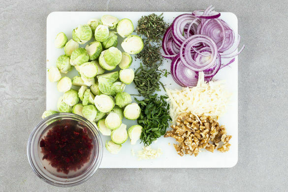Die Cranberrys grob hacken und in warmem Wasser einweichen. Den Rosenkohl halbieren. Die Kräuter abzupfen und separat fein hacken. Den Knoblauch schälen und fein würfeln. Die Zwiebel schälen und in sehr feine Ringe schneiden. Die Walnüsse grob hacken. Den Käse grob reiben.