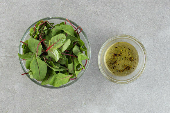 Aus 2EL Olivenöl, 2EL Essig, 1–2EL Wasser, 1 Prise Zucker, 1/2TL Salz und 1 kräftigen Prise Pfeffer ein Dressing anrühren und mit dem Mangold vermengen. Den gefüllten Kürbis mit der Sauce und dem Salat anrichten, mit der Petersilie garnieren und servieren.