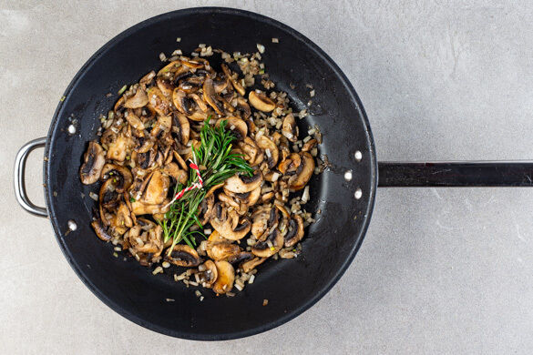 Die Pilze, die Zwiebeln und den Knoblauch in einer mittelgroßen Pfanne mit 1EL Olivenöl bei starker Hitze 2–3Min. anbraten. Dabei nicht zu oft wenden, damit die Pilze schön bräunen. Den Rosmarin und den Thymian mit einem Bindfaden oder Küchengarn zusammenbinden und zu den Pilzen in die Pfanne geben.
