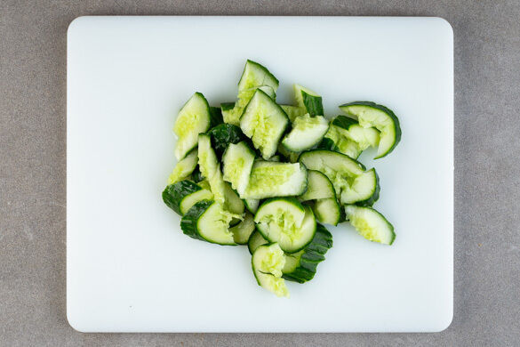 Die Gurken auf ein Brett legen und mit einer schweren Pfanne oder einem Nudelholz so lange schlagen, bis die Gurken auf- bzw. in Stücke brechen, dann schräg in mundgerechte Stücke schneiden.
