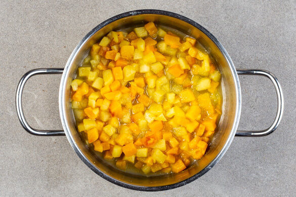 Den Backofen auf 200°C (180°C Umluft) vorheizen. Die Schale 1 Zitrone abreiben, die Zitronen halbieren und auspressen. Den Apfel und die Kakis schälen, in ca. 1cm große Würfel schneiden und in einem kleinen Topf mit 5EL Zitronensaft, 2TL Zitronenschale und 6EL Wasser bei mittlerer Hitze aufkochen. Bei niedriger Hitze 10–15Min. einkochen lassen, dann im Kühlschrank abkühlen.