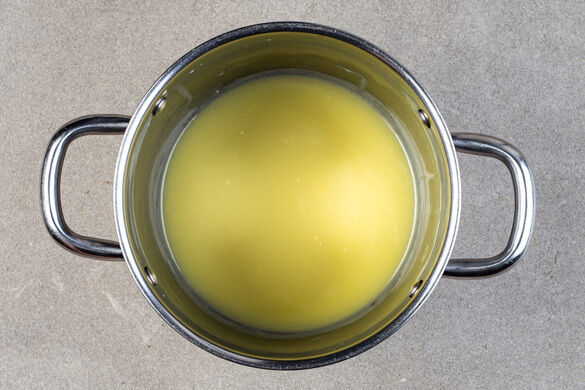 60g Zucker, den Vanillezucker, 50ml Schlagsahne, 80g Butter, 2EL Honig und 1 Prise Salz in einem weiteren kleinen Topf bei niedriger Hitze verrühren, bis die Butter geschmolzen ist und Zucker und Salz sich vollständig aufgelöst haben.
