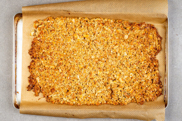 Den Topf vom Herd nehmen und die Mandelblättchen sowie 150g Haferflocken einrühren. Die Mandel-Haferflocken-Mischung gleichmäßig auf einem mit Backpapier ausgelegten Backblech verteilen und auf der mittleren Schiene 12–15Min. goldbraun backen. Das Topping aus dem Ofen nehmen, ca. 5Min. abkühlen lassen und anschließend mit den Händen zerkrümeln.