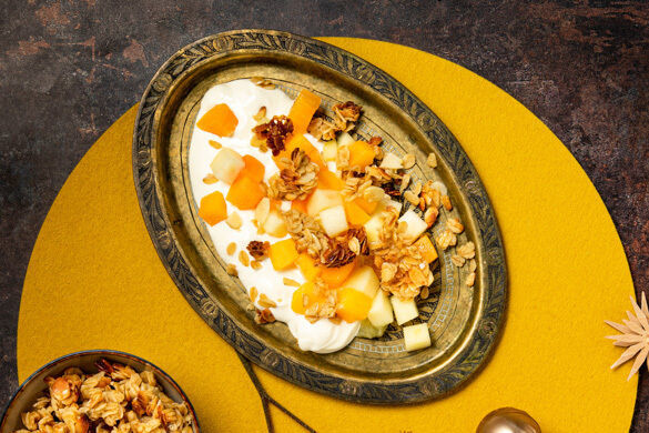 Für dieses leckere vorweihnachtliche Dessert haben wir uns vom guten alten Bienenstich inspirieren lassen. Das knusprig-süße Topping aus Mandeln und Haferflocken wird ganz unkompliziert im Ofen zubereitet. Mit seiner fruchtig-feinen Grundlage aus Apfel und Kakifrucht und der darauf schwebenden Creme aus weißer Schokolade und Schlagsahne zergeht es förmlich auf der Zunge. Herrlich!