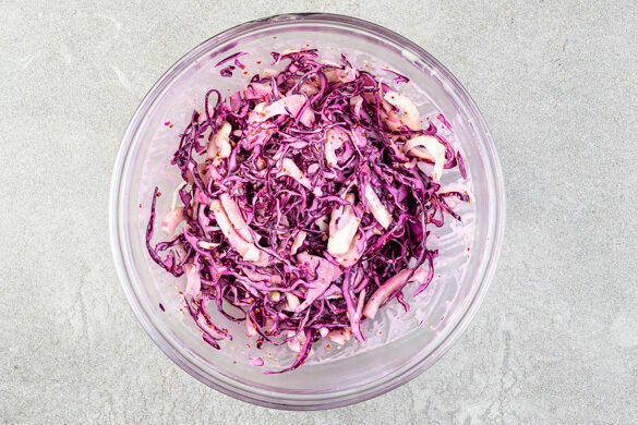 Den Rotkohl mit einem Messer in hauchfeine Streifen schneiden, dabei den Strunk und die äußeren Blätter entfernen. 2EL Honig, 2EL Senf, 4EL Mayonnaise, 4EL Olivenöl und 2EL Essig gut verrühren. Das Dressing mit dem Fenchel und dem Rotkohl zu einem Salat vermengen.