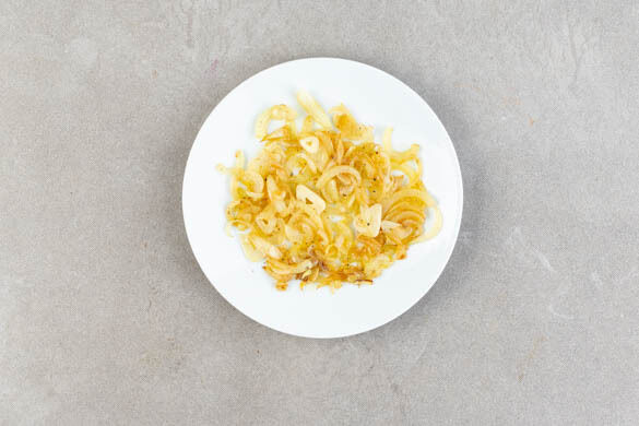 Die Zwiebeln in einer großen Pfanne mit dem Sardellenöl bei starker Hitze ca. 2Min. anbraten. Die Hitze reduzieren, den Knoblauch dazugeben und bei mittlerer Hitze 1–2Min. mitbraten. Mit Salz und Pfeffer abschmecken, aus der Pfanne nehmen und mit den Sardellen vermengen. Die Pfanne nicht auswischen.