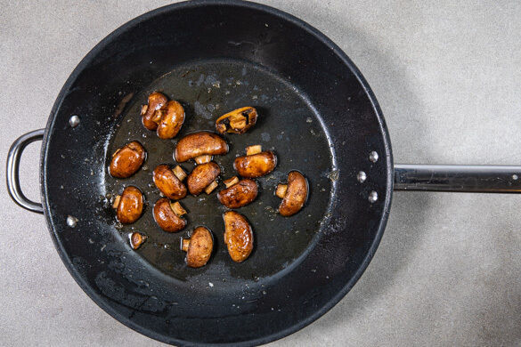 Die Pilze je nach Größe halbieren oder vierteln, dann in einer großen Pfanne mit 2EL Olivenöl und 1 kräftigen Prise Salz bei starker Hitze ca. 6Min. anbraten, dabei gelegentlich umrühren. Die Pilze anschließend aus der Pfanne nehmen und beiseitestellen.