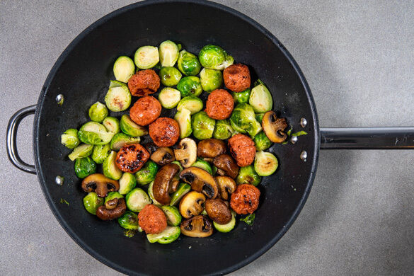 Den Rosenkohl je nach Größe halbieren oder vierteln, dann in derselben Pfanne mit 2EL Olivenöl und 1/2TL Salz bei starker Hitze ca. 6Min. anbraten. Die veganen Hackbällchen und die Pilze mit in die Pfanne geben und ca. 4Min. mitbraten. Den Knoblauch schälen und fein würfeln, mit in die Pfanne geben und ca. 1Min. mitbraten. Bis zum Servieren warm halten.