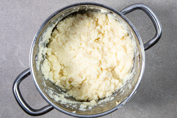 In einem großen Topf ausreichend gesalzenes Wasser zum Kochen bringen. Die Pastinaken und den Sellerie schälen und in 1–2cm große Würfel schneiden. Sobald das Wasser kocht, das Gemüse hineingeben und in 22–25Min. sehr weich kochen.