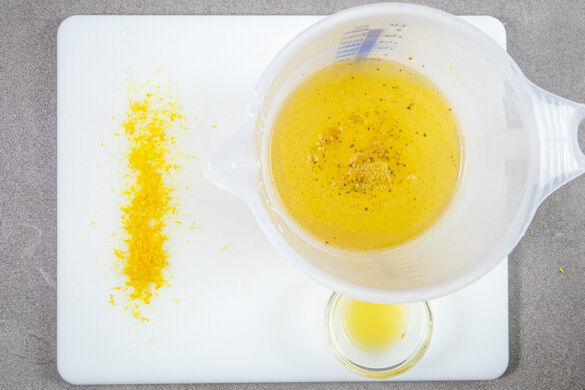 Den Backofen auf 220°C (200°C Umluft) vorheizen. Die Zitronenschale abreiben, dann die Zitrone halbieren und auspressen. Das Brühgewürz und 2EL Zitronensaft in 750ml warmes Wasser einrühren.