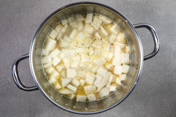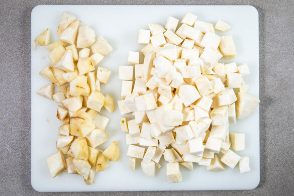 Den Sellerie und den Topinambur schälen und in ca. 1cm große Würfel schneiden.