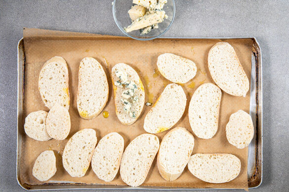 Die Brötchen diagonal in Scheiben schneiden und jede Scheibe mit etwa 1TL Käse bestreichen. Die Brötchenscheiben auf einem mit Backpapier ausgelegten Backblech verteilen und 4–6Min. im Ofen backen, bis die Brötchen knusprig und goldbraun sind, dann aus dem Ofen nehmen und mit den karamellisierten Schalotten belegen.