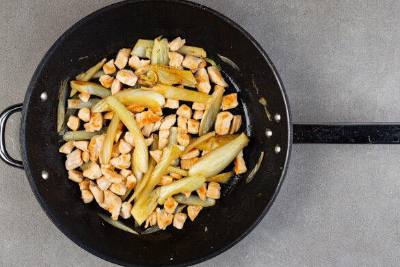 Den Fenchel in derselben Pfanne mit 1EL Olivenöl ca. 1Min. auf jeder Seite goldbraun anbraten. 75ml Wasser und 1 kräftige Prise Salz hinzufügen, dann abgedeckt bei niedriger Hitze ca. 8Min. garen, bis der Fenchel weich ist. Das Fleisch mit 1EL hellem Essig und 1TL Zucker zurück in die Pfanne geben und abgedeckt ca. 2Min. köcheln, bis das Fleisch gar ist.