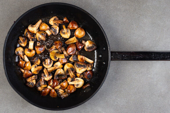 Die Pilze ggf. säubern und je nach Größe halbieren oder vierteln, dann in einer weiteren mittelgroßen Pfanne mit 1EL Olivenöl und 1 kräftigen Prise Salz bei sehr starker Hitze in 8–9Min. goldbraun und gar braten.