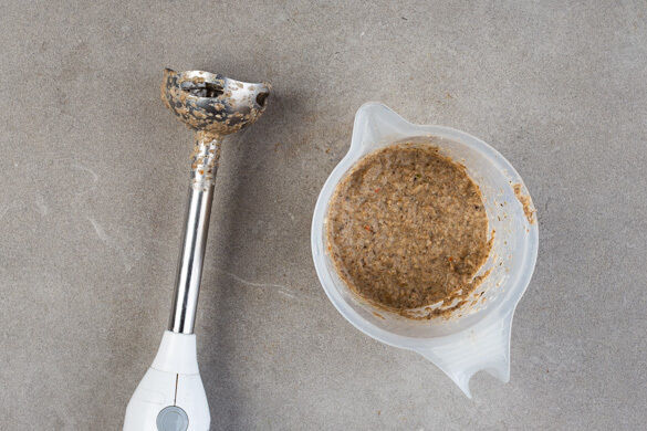 Die Pilzpfanne vom Herd nehmen und den Knoblauch untermengen. Die Pilze, den Feta, die Gewürzmischung und den Bratensaft aus der Fenchelpfanne mit 1 kräftigen Prise Pfeffer, 1,5TL hellem Essig und 4EL Pastawasser in einem hohen Gefäß pürieren. Die Pasta mit dem Pesto, dem Fenchel und dem Fleisch vermengen und mit dem Fenchelgrün garniert servieren.