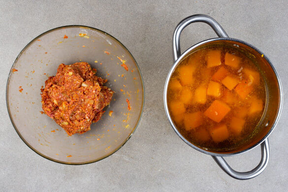 Die Kürbisse samt Schale halbieren, mit einem Löffel entkernen und in 1–2cm große Würfel schneiden. Mit dem Brühgewürz in das kochende Wasser geben und in 10–12Min. weich kochen. Die Zwiebeln schälen, halbieren und fein würfeln. Das Hackfleisch mit der 1/2 der Zwiebeln, 3/4 der Currypaste, 1 Ei, 3TL Mehl und je 1 kräftigen Prise Salz und Pfeffer vermengen.