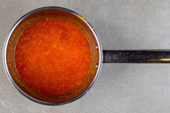 Die restlichen Zwiebeln in einem kleinen Topf mit 2EL Butter bei mittlerer bis starker Hitze 2–3Min. anbraten. Die restliche Currypaste und den Knoblauch hinzufügen und ca. 30Sek. mitbraten. Mit dem Tomatenpüree und 150ml Wasser ablöschen und bei niedriger Hitze 10–15Min. köcheln. In einem mittelgroßen Topf 600ml leicht gesalzenes Wasser aufkochen.