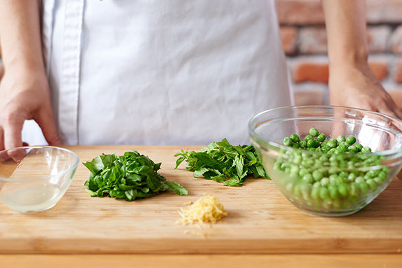 Ofen auf 180°C Umluft vorheizen. Topf mit ausreichend gesalzenem Wasser für die Pasta zum Kochen bringen. Kräuter waschen und grob hacken. Erbsen pullen. Zitrone waschen, trocken reiben, Schale abreiben und Saft auspressen, getrennt voneinander beiseitestellen.