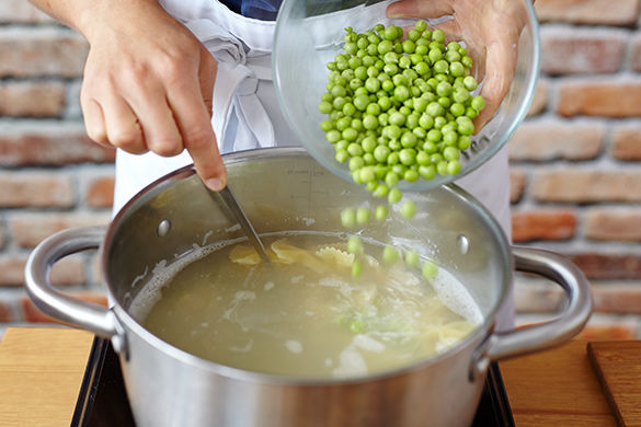 Sobald das Wasser kocht, die Nudeln hineingeben und ca. 8Min. vorkochen, dann die Erbsen zugeben und 2Min. mitkochen. Das Wasser abgießen und beides in einem Sieb abtropfen lassen.