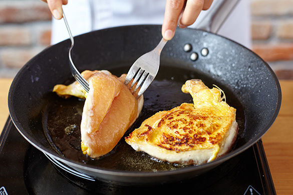 Pfanne mit 2EL Öl auf mittlere Stufe erhitzen und das Huhn auf beiden Seiten ca. 2-3Min. goldbraun braten. Nun mit Salz und Pfeffer würzen, auf ein mit Backpapier ausgelegtes Backblech oder in eine Auflaufform geben und im Ofen ca. 12-15Min. gar backen.