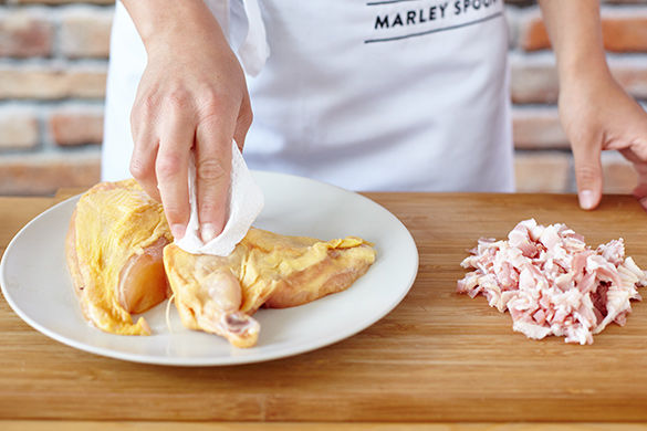 Das Fleisch kurz unter kaltem Wasser abspülen und trocken tupfen. Bacon in dünne Streifen schneiden.