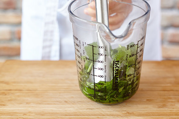 Inzwischen die Kräuter mit 2EL Öl fein pürieren. Mit 1TL Zitronensaft, 2TL der Schale, Salz und Pfeffer abschmecken. Den Bacon in der Pfanne, in der das Huhn angebraten wurde, knusprig braten und anschließend die Butter zugeben.