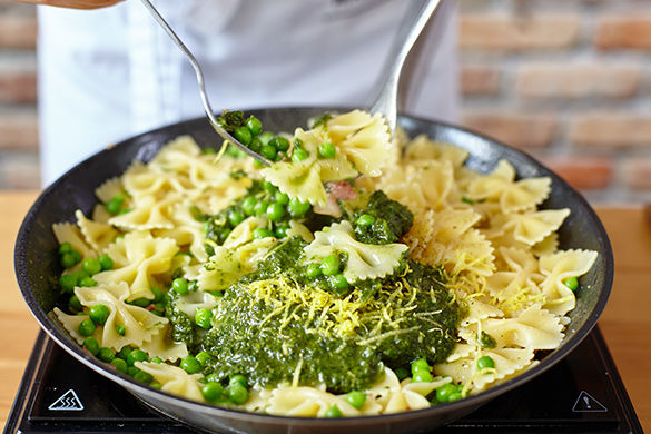 Wir haben Schmetterlinge im Bauch. Diese kleinen, italienischen Klassiker haben uns mit einer Sauce aus frischen Käutern, fein gewürfeltem Speck und Erbsen total den Kopf verdreht. Richtet das knusprig gebratene Stück Maishühnchenbrust darauf an und ihr werdet wissen, wovon wir sprechen.