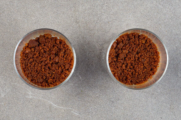 Ca. 1/4 der Keksbrösel für die Garnitur aufbewahren, die übrigen Keksbrösel gleichmäßig auf 2 oder 4 Gläser verteilen und mit einem Löffel oder den Fingern sanft andrücken. Bis zur Fertigstellung im Kühlschrank aufbewahren. Tipp: Wer mag, kann diesen Schritt überspringen und das Dessert später auf schönen Tellern oder Schalen anrichten.
