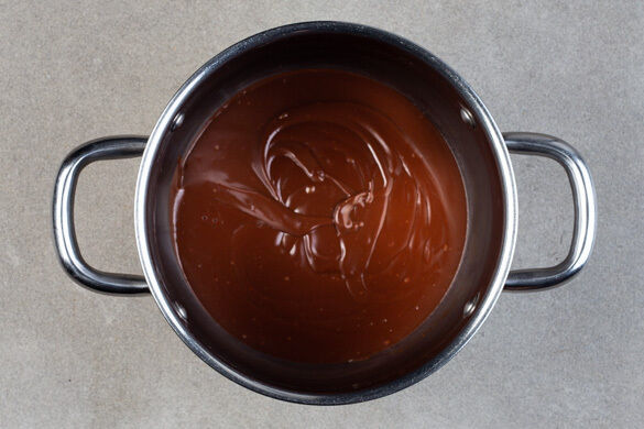 In einem zweiten Topf 30g Zucker, den Kakao, 15g Stärke und 1 Prise Salz mit einem Schneebesen verrühren. Die Milch bei mittlerer Hitze nach und nach unter ständigem Rühren angießen, sodass möglichst keine Klümpchen entstehen. Unter regelmäßigem Rühren aufkochen und ca. 1Min. köcheln, bis der Pudding andickt. Vom Herd nehmen und die Schokodrops und 1EL Butter unterrühren.