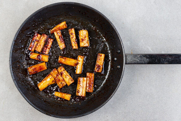 Die Schwarzwurzeln aus dem Essigwasser nehmen und abtropfen lassen, ggf. mit etwas Küchenkrepp trocken tupfen. In der Pfanne bei mittlerer bis starker Hitze 6–8Min. goldbraun und weich braten, die Pfanne vom Herd nehmen und beiseitestellen.