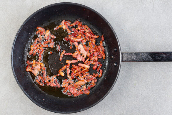 Den Speck in einer mittelgroßen Pfanne bei starker Hitze 5–7Min. knusprig anbraten. Aus der Pfanne nehmen und auf Küchenkrepp abtropfen lassen, die Pfanne mit ca. 1EL Fett aufbewahren.