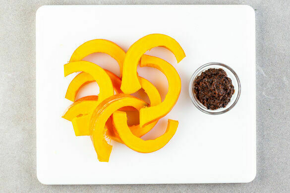 Den Backofen auf 230°C (210°C Umluft) vorheizen. In einem großen Topf ausreichend gesalzenes Wasser für die Nudeln zum Kochen bringen. Die Kürbisse halbieren, entkernen und in fingerdicke Spalten schneiden. 3/4 der Misopaste mit dem Sesam, 2EL Wasser und 2 Prisen Salz verrühren.