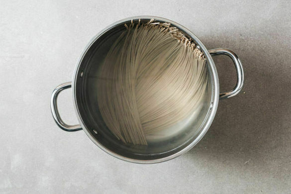 Die Nudeln in das kochende Wasser geben und in ca. 4Min. bissfest kochen. In ein Sieb abgießen, die Nudeln sehr gründlich mit kaltem Wasser abspülen und abtropfen lassen.