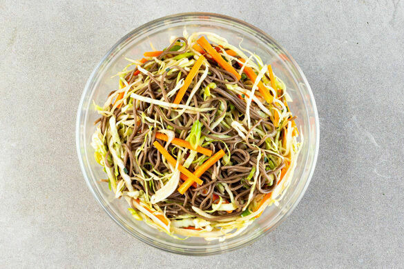 Den Chinakohl in feine Streifen schneiden. Die Lauchzwiebeln in dünne Ringe schneiden. Die Karotten ggf. schälen, längs halbieren und in feine Stifte schneiden oder grob raspeln. Den Kohl, die Karotten, die Lauchzwiebeln, die Nudeln und das Dressing zu einem Salat vermengen. Mit Salz und Pfeffer abschmecken.