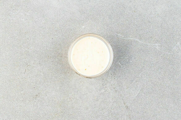 Den Schnittlauch in kleine Ringe schneiden. Die restliche Misopaste mit der 1/2 des Schnittlauchs, dem Sesamöl, 2EL hellem Essig, 4EL Wasser, 1/2–1TL Salz und 1 kräftigen Prise Pfeffer verrühren.