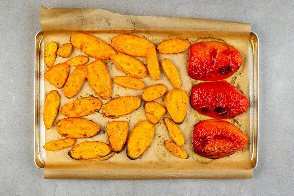 Die Paprika vierteln, entkernen und mit 2EL Olivenöl sowie je 1 Prise Salz und Pfeffer einreiben. Die Karotten und die Paprika auf einem oder ggf. zwei mit Backpapier ausgelegten Backblech(en) verteilen und ca. 20Min. im Ofen backen.