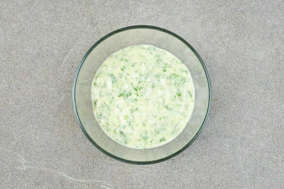 Den Koriander samt Stängeln fein schneiden und mit der 1/2 der Mayonnaise, 2EL Olivenöl und 2TL Essig verrühren. Den Dip mit Salz abschmecken.