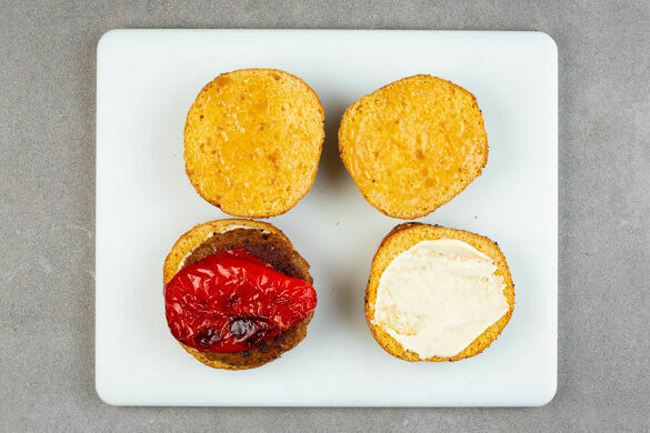 Die Pattys in einer großen Pfanne mit 2EL Olivenöl bei mittlerer Hitze auf jeder Seite 3–4Min. braten, bis sie goldbraun und gar sind. Beide Seiten nach Geschmack mit der Gewürzmischung verfeinern und die gewürzten Seiten noch mal ca. 30Sek. anbraten, dann die Pattys aus der Pfanne nehmen und beiseitestellen.