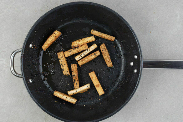 In einem großen Topf ausreichend gesalzenes Wasser für die Nudeln zum Kochen bringen. Eine große Pfanne stark erhitzen und den Tofu darin mit 1EL Pflanzenöl, dem Sesam sowie je 1 Prise Salz und Pfeffer 3–4Min. knusprig und goldbraun anbraten. Auf einem Teller beiseitestellen.