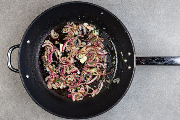 Die Zwiebel schälen, halbieren und in feine Streifen schneiden, dann in derselben Pfanne mit 1EL Olivenöl bei mittlerer Hitze in ca. 2Min. glasig anschwitzen. Inzwischen den Knoblauch schälen und in feine Scheibchen schneiden. Die Thymianblättchen von den Stängeln zupfen. Den Knoblauch und die Thymianblättchen in die Pfanne geben und ca. 2Min. mitbraten.