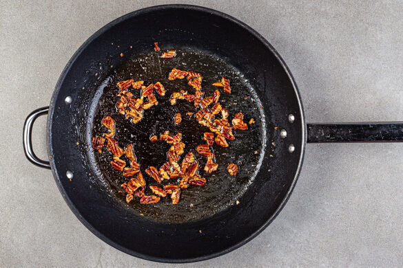 Die Zitrone halbieren und auspressen. Die Pekannusskerne grob hacken und in derselben Pfanne mit 2EL Pflanzenöl bei mittlerer bis niedriger Hitze 2–3Min. anrösten, bis die Nüsse zu bräunen beginnen. Den Zitronensaft und 1TL Honig unterrühren und 1–2Min. einköcheln lassen. Die Pfanne anschließend vom Herd nehmen.
