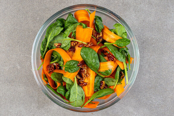 Die Karotte ggf. schälen, dann mit einem Sparschäler rundum in dünne Streifen schneiden. Die Karotten mit dem Spinat und dem Pekannussdressing vermengen, mit Salz und Pfeffer abschmecken. Den Flammkuchen aus dem Ofen nehmen, ebenfalls mit Salz und Pfeffer abschmecken, in Stücke schneiden und auf Teller verteilen. Den Salat auf oder neben dem Flammkuchen servieren.