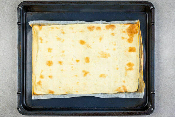 Den Backofen auf 220°C (200°C Umluft) vorheizen. Die Teige mit dem Papier nach unten auf zwei Backblechen ausrollen. Mit einem Messer einen 1–2cm breiten Rand in die Teige ritzen. Mehrere kleine Löcher in den übrigen Teil der Teige stechen. Die Teige anschließend 7–10Min. im Ofen backen, bis sie leicht gebräunt sind. Ggf. nach der Hälfte der Zeit die Position der Bleche tauschen.