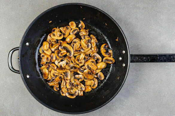 Die Pilze in einer großen Pfanne mit 2EL Butter oder Pflanzenöl, der 1/2 des Oregano und 1 kräftigen Prise Salz bei mittlerer bis starker Hitze 4–5Min. braten, bis die austretende Flüssigkeit größtenteils verdampft ist und die Pilze leicht gebräunt sind. Ggf. übrige Flüssigkeit abgießen, die Pfanne aufbewahren.