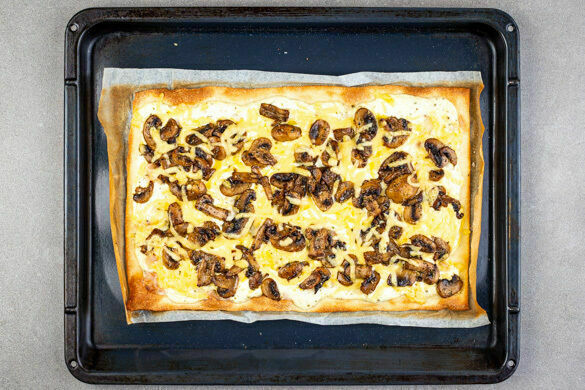 Wie auf dem Weihnachtsmarkt! So schmeckt der knusprige Teig, den du heute mit spritzig gewürzter Crème fraîche, zartwürzigem Gouda und Babyspinat belegst. Während der herzhafte Kuchen im Ofen bäckt, hast du Zeit, einen schnellen Salat aus Möhrchenstreifen und kandierten Pekannüssen zuzubereiten. Und schon steht der Flammkuchen auf dem Tisch! Ein Rezept für die ganze Familie, – aber wer will dieses Prachtstück schon teilen?