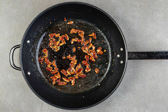 Die Zitrone halbieren und auspressen. Die Pekannusskerne grob hacken und in derselben Pfanne mit 3EL Pflanzenöl bei mittlerer bis niedriger Hitze 2–3Min. anrösten, bis die Nüsse zu bräunen beginnen. Den Zitronensaft und 1EL Honig unterrühren und 1–2Min. einköcheln lassen. Die Pfanne anschließend vom Herd nehmen.