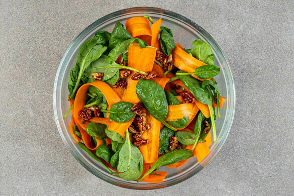 Die Karotte ggf. schälen, dann mit einem Sparschäler rundum in dünne Streifen schneiden. Die Karotten mit dem Spinat und dem Pekannussdressing vermengen, mit Salz und Pfeffer abschmecken. Die Flammkuchen aus dem Ofen nehmen, ebenfalls mit Salz und Pfeffer abschmecken, in Stücke schneiden und auf Teller verteilen. Den Salat auf oder neben den Flammkuchen servieren.