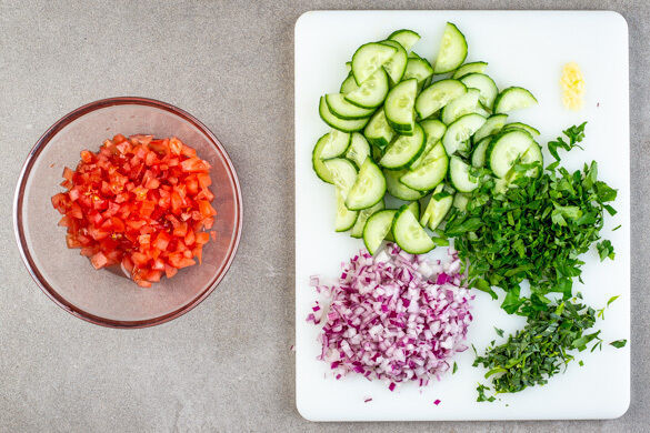 Die Zwiebel und den Knoblauch schälen und fein würfeln. Die Gurke längs halbieren und in ca. 0,5cm dünne Scheiben schneiden. Die Tomaten in kleine Würfel schneiden. Die Estragonblätter abzupfen und grob schneiden. Die Petersilie samt Stängeln grob hacken.