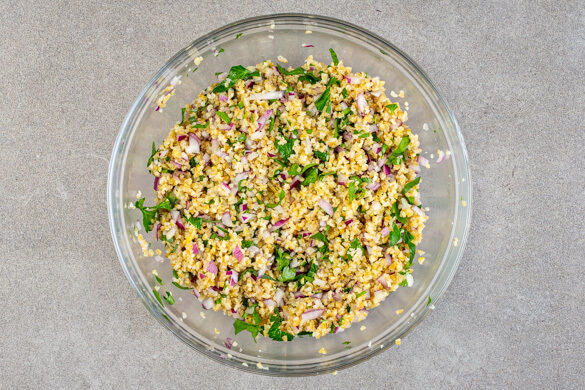 Die Zwiebeln und die Petersilie unter den Bulgur mengen und den Bulgur mit Salz und Pfeffer abschmecken.